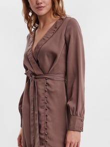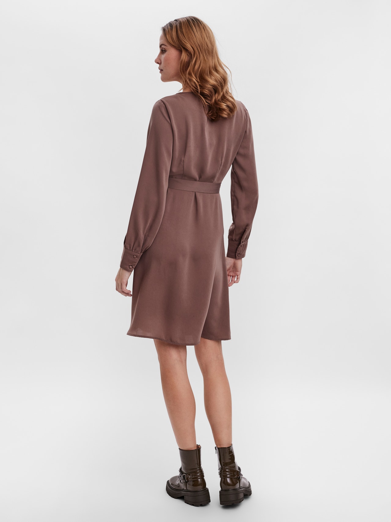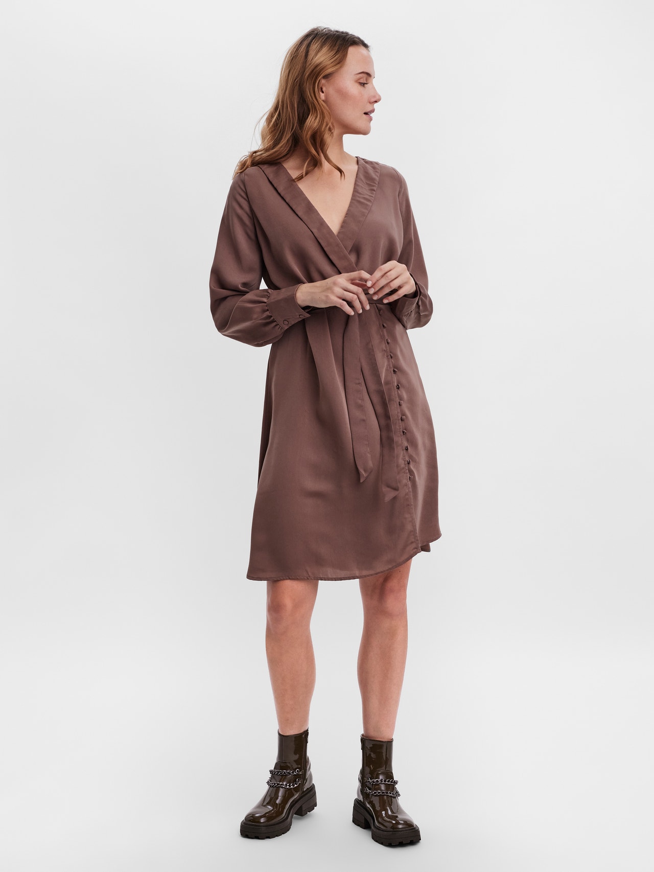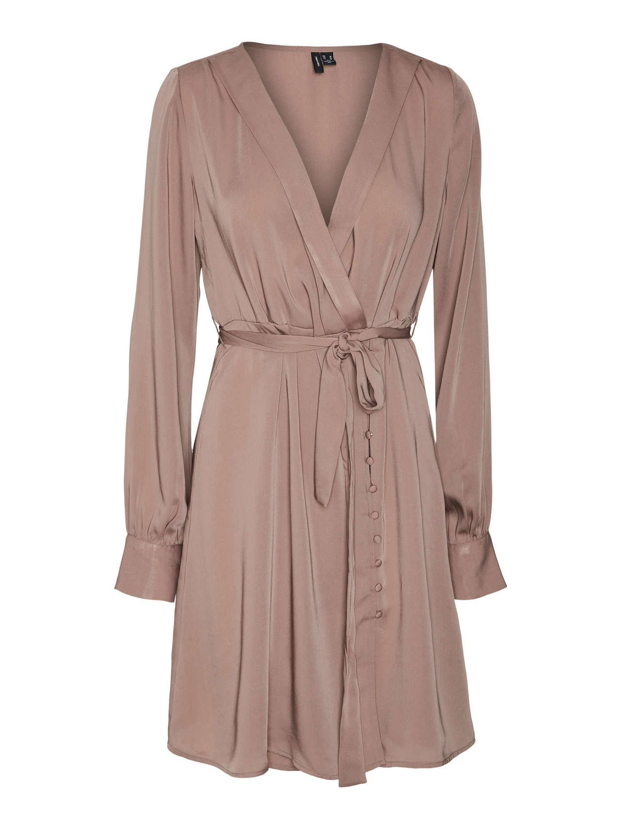 Mini dress with a v-neckline, a fabric tie-string at the waist, buttoned cuffs, and a button detail at the skirt. Style this stunning dress with some heeled pumps for a stylish everyday look.