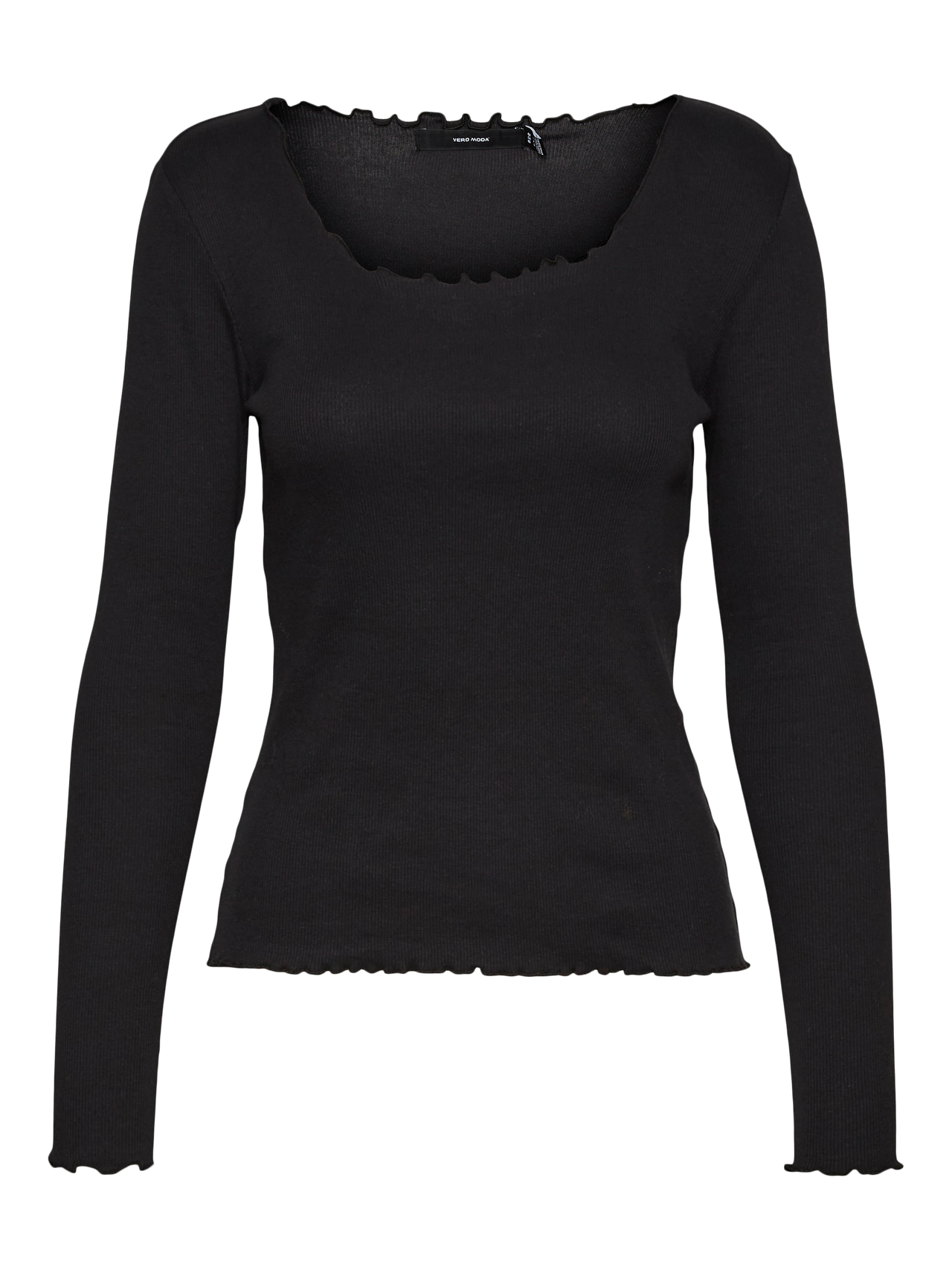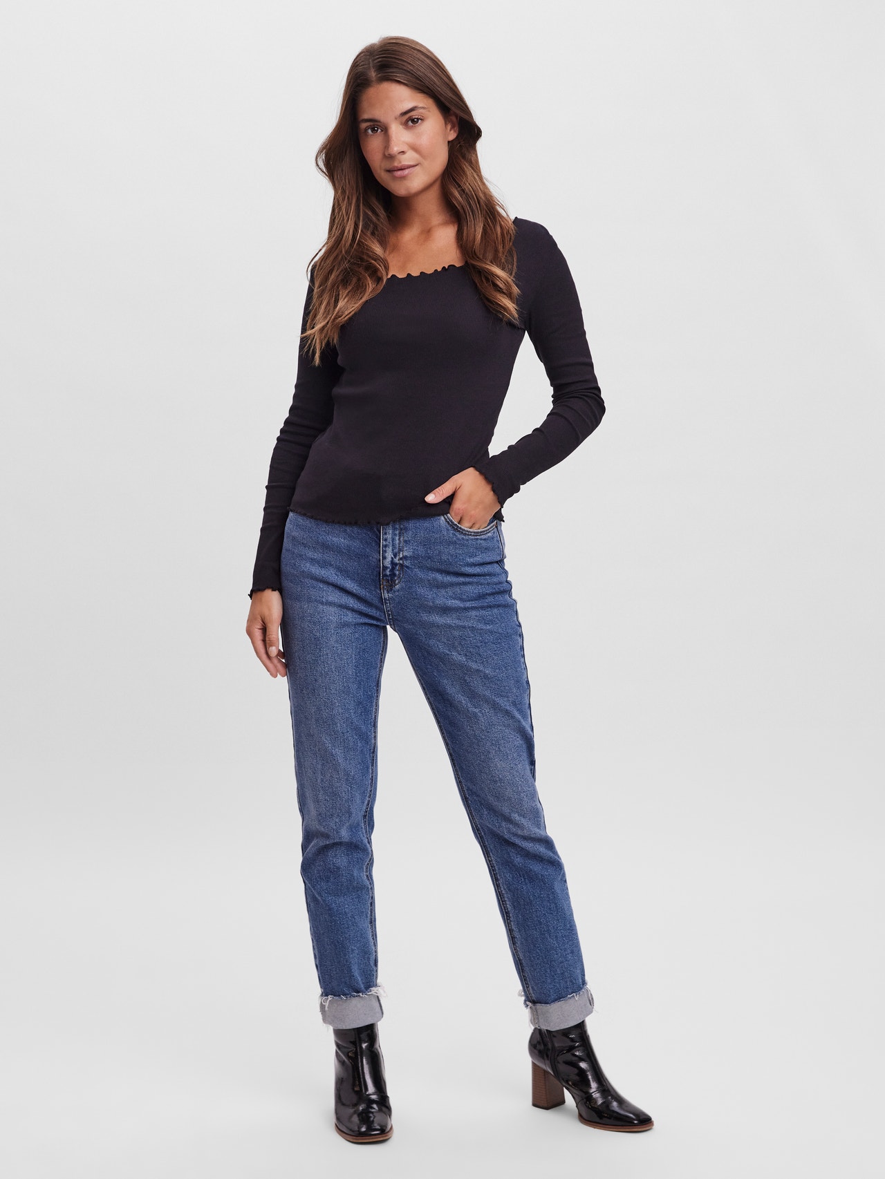 Long-sleeved top with a wide neckline, baby lock details at the neckline, cuffs, and bottom hem. Style this wardrobe staple with your denim favourites and some chunky, laced boots for a stylish everyday look.
