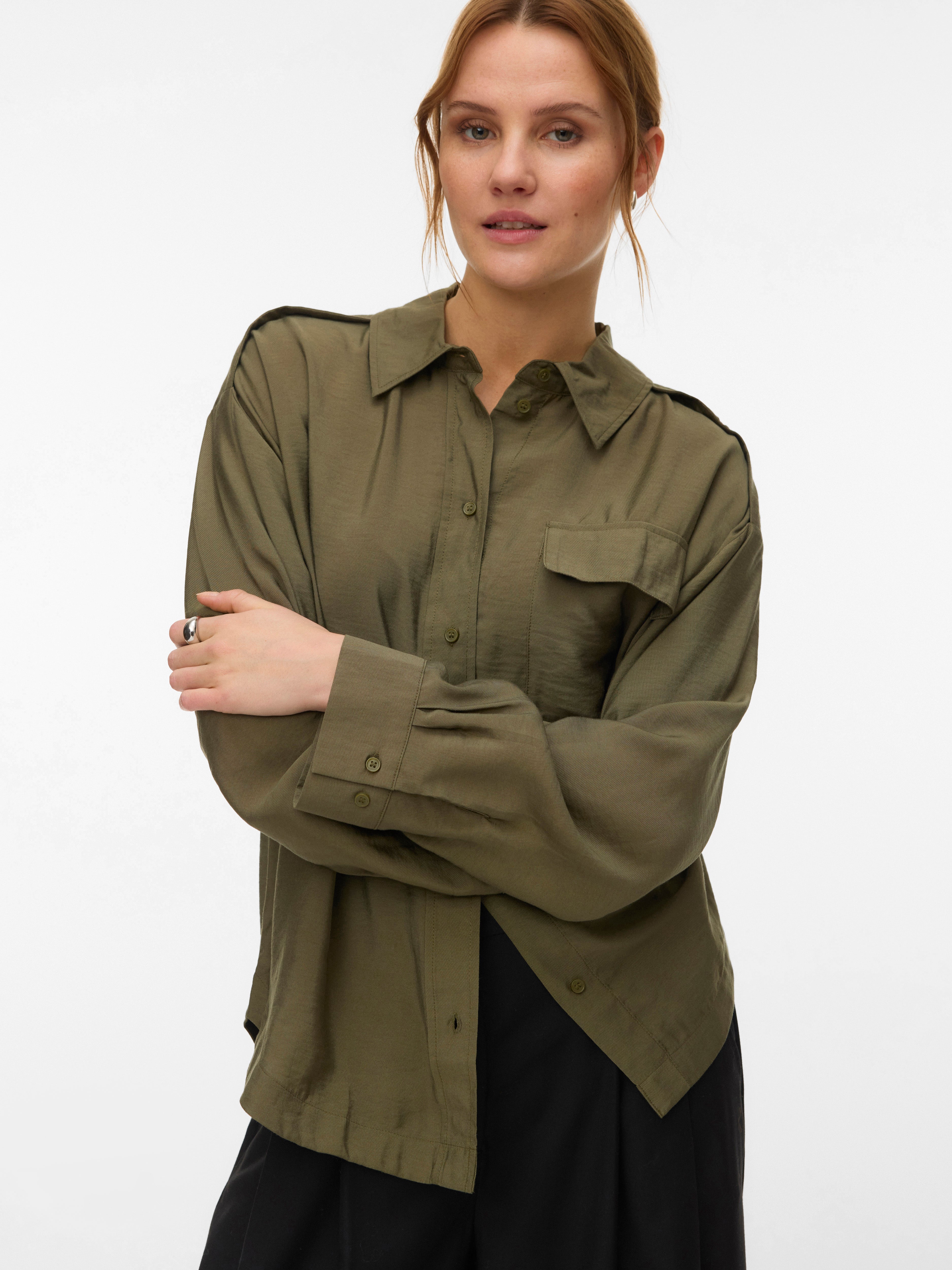 Deze blouse is een chique en veelzijdige toevoeging aan je garderobe, aangezien je hem op zichzelf of open over een simpele top kunt dragen. Combineer het met klassieke jeans en een simpel T-shirt voor een gave, alledaagse look of draag het met een broek en hoge hakken.