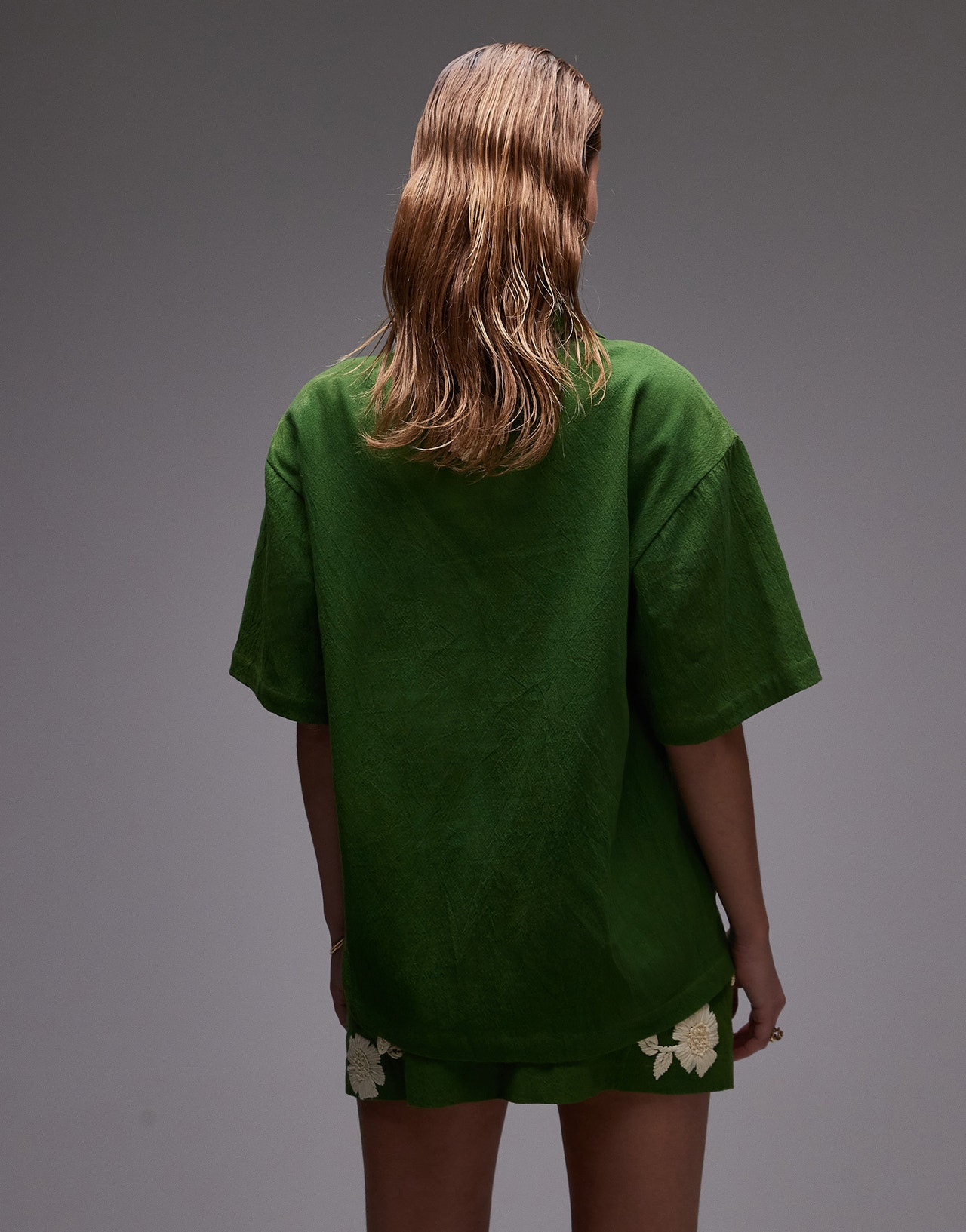 Topshop co-ord resort shirt in green with raffia flowers - MGREEN