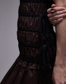 Topshop cap sleeve shirred dress with tie sides in brown with contrast black ties - BRONZE