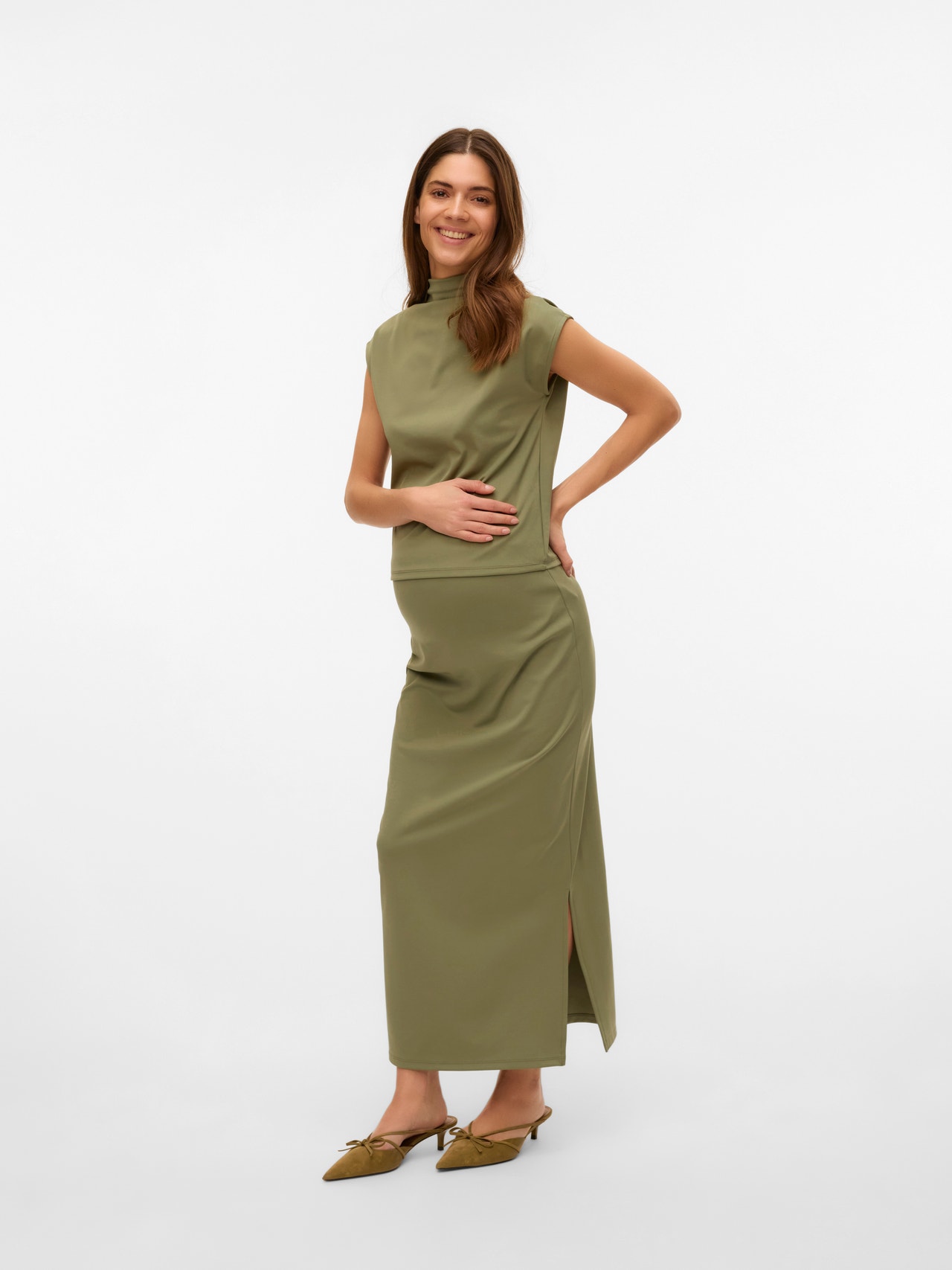 Noś ulubione topy i koszule do fajnej spódnicy, która idealnie dopasowuje się do rosnącego brzuszka i daje wygodny i lekki wygląd odpowiedni na każdą okazję.