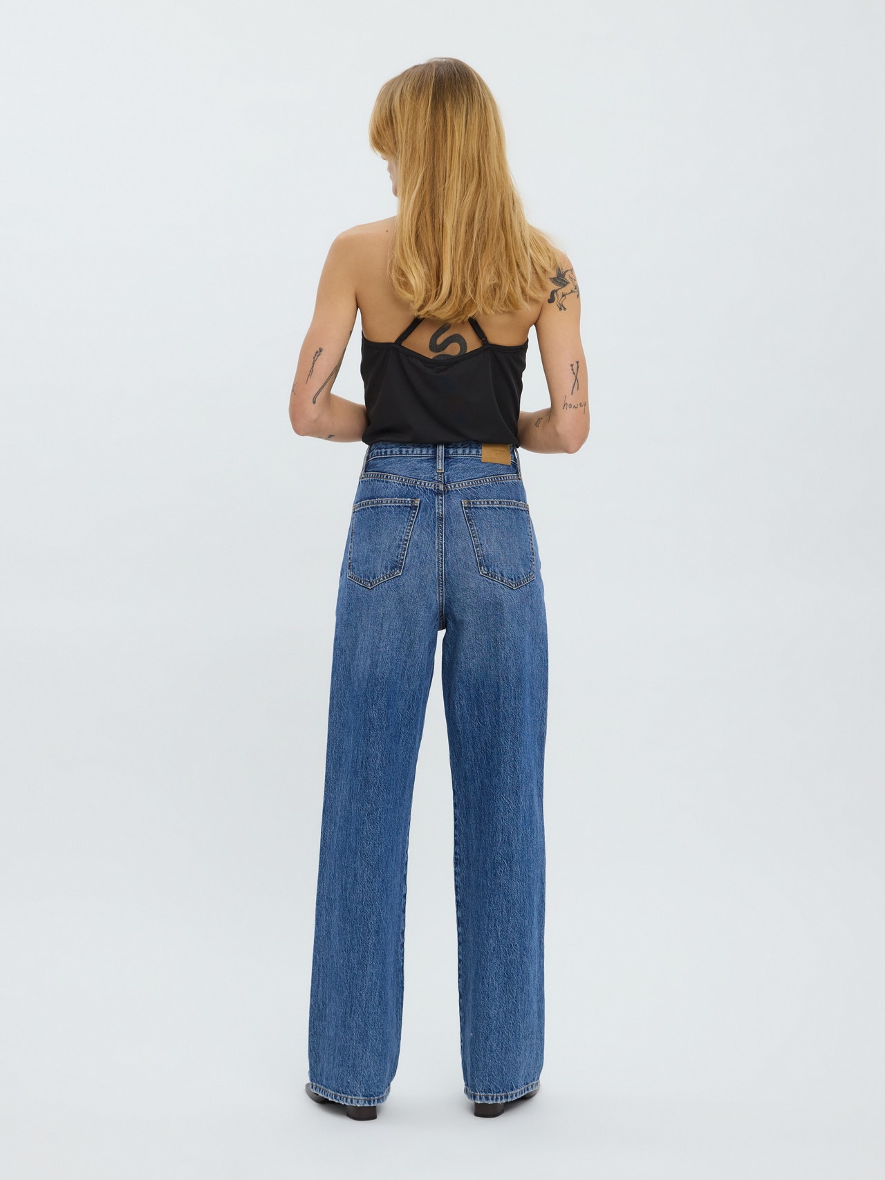 Wide, high-rise jeans with five pockets and belt loops. The perfect pair of wide jeans to add to your essential wardrobe. Style these cool jeans with a simple long sleeved top and a pair of heels for a chic, stylish look.