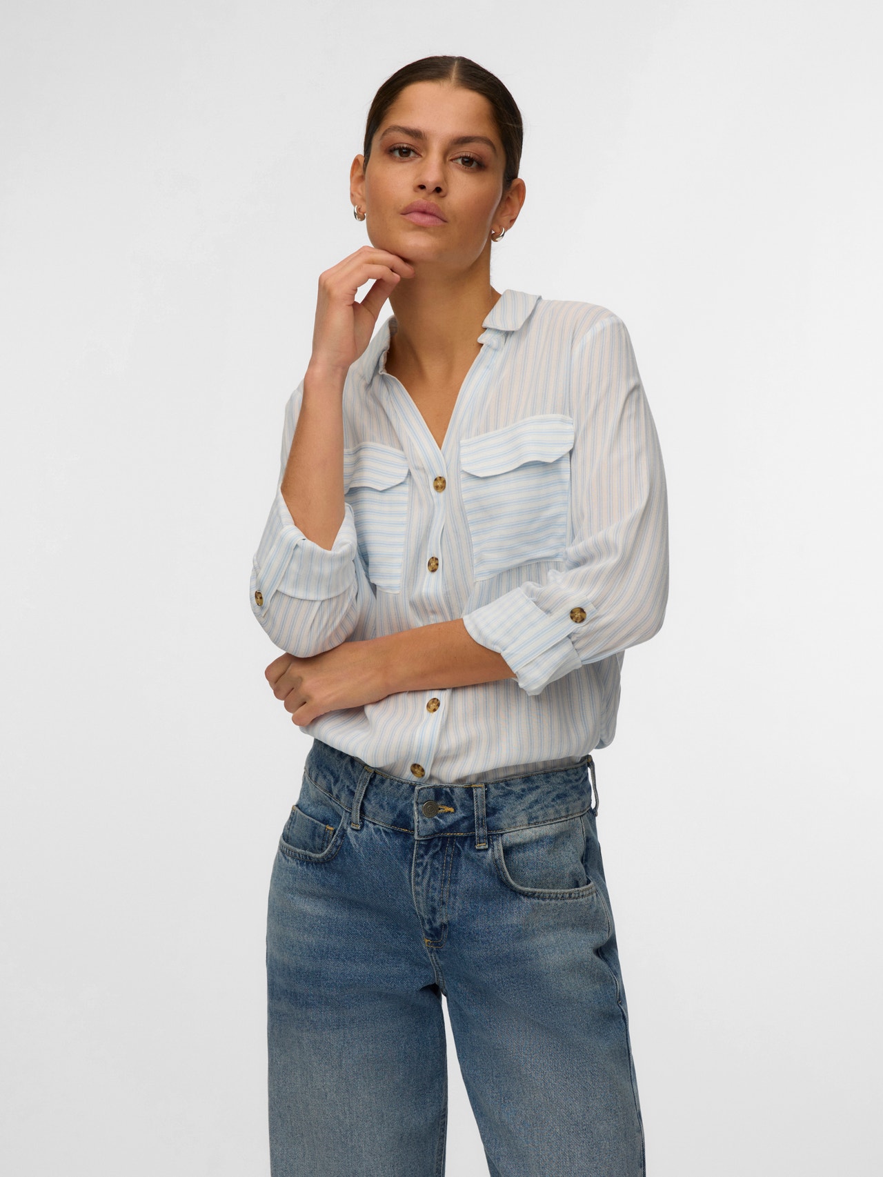 Den här skjortan är ett elegant och mångsidigt tillskott till din garderob eftersom den kan bäras på egen hand eller öppen med en enkel topp under. Kombinera den med klassiska jeans och en enkel t-shirt för en cool vardagslook eller klä upp den genom att lägga till ett par byxor och klackar.