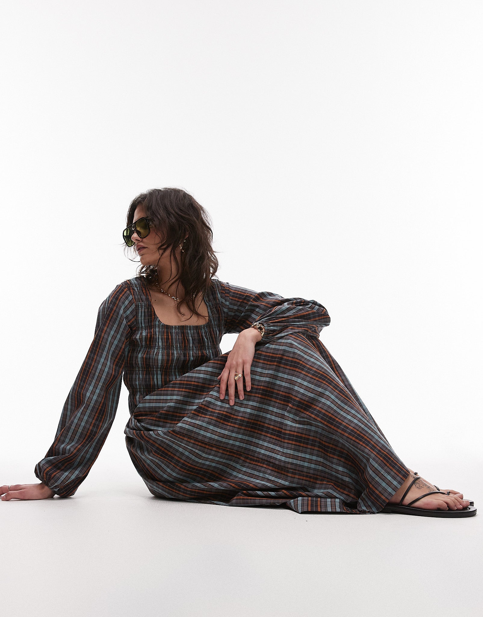 Topshop shirred long sleeve midi dress in blue vintage check - MBLUE